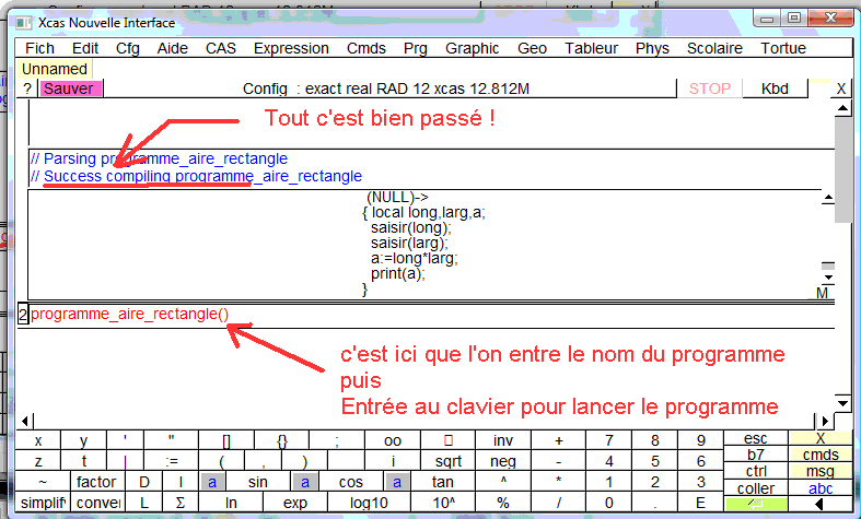 7. Recommencer pour d'autres valeurs des cotés et vérifier les résultats. ( cliquer après le nom du programme dans la barre de saisie2 puis Entrée ...)